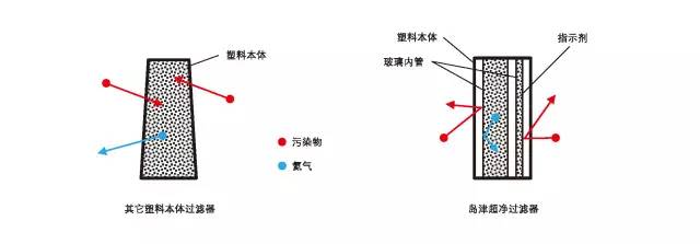 塑料本體有助于檢查指示劑和更換濾芯。然而,它也可能使污染物擴散到儀器并可導致氦氣泄漏。為了解決這個問題,島津超凈氣體過濾器設計成外面包裹塑料,吸附劑填充在玻璃管內,由此防止擴散。