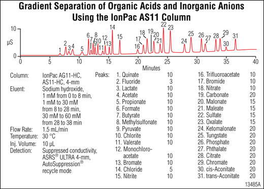 Use the Dionex Ionpac AS11 for fast analysis of organic acids and anions in