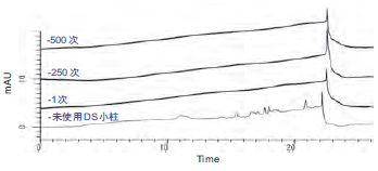 下面是梯度分析重復500次之后的基線圖譜。與未使用DS小柱的結果相比,很明顯看出使用DS小柱可以有效去除鬼峰。而且,無論是1次還是第500次分析之后,都沒有鬼峰出現。實驗結果表明,DS小柱可以穩定富集的雜質,并對長時間多次分析有足夠的負載容量。